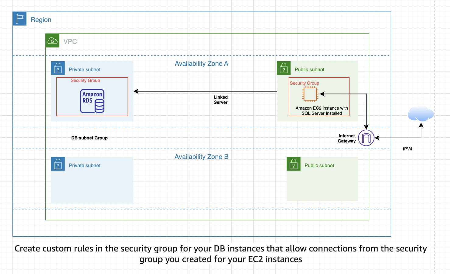 For each of the following scenarios, you must allow network traffic by using the appropriate TCP port through the security group for each inbound instance of the database server. In other words, if you’re connecting Amazon EC2 SQL Server to Amazon RDS for MySQL, you must allow traffic from the IP address of the EC2 instance, as well as on the port that MySQL is using to listen for database communications.