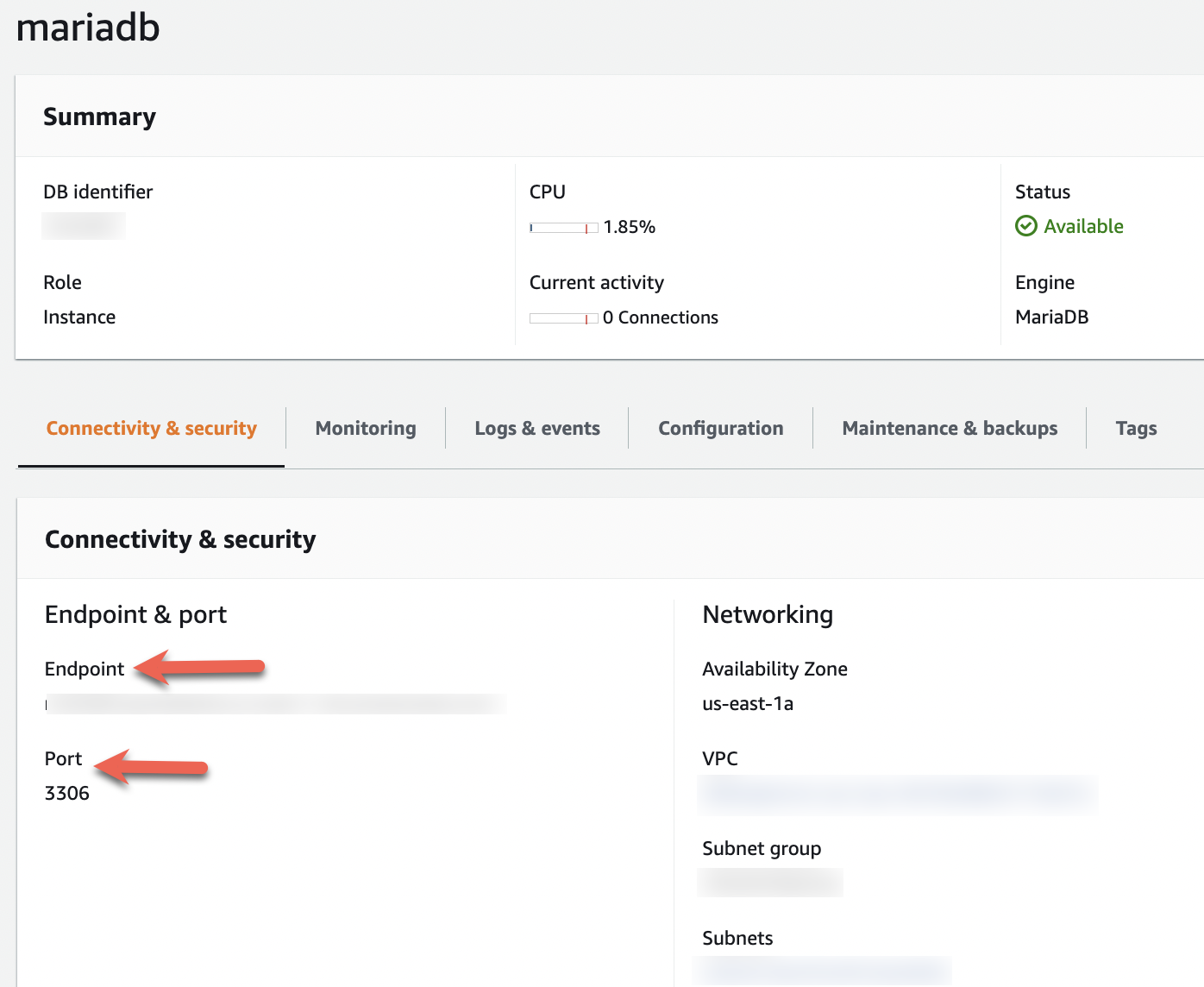 - On the Amazon RDS console, choose the MariaDB database instance.