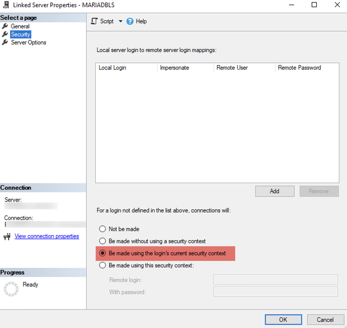 - On the Security page, for the remote server login, use the current security context.