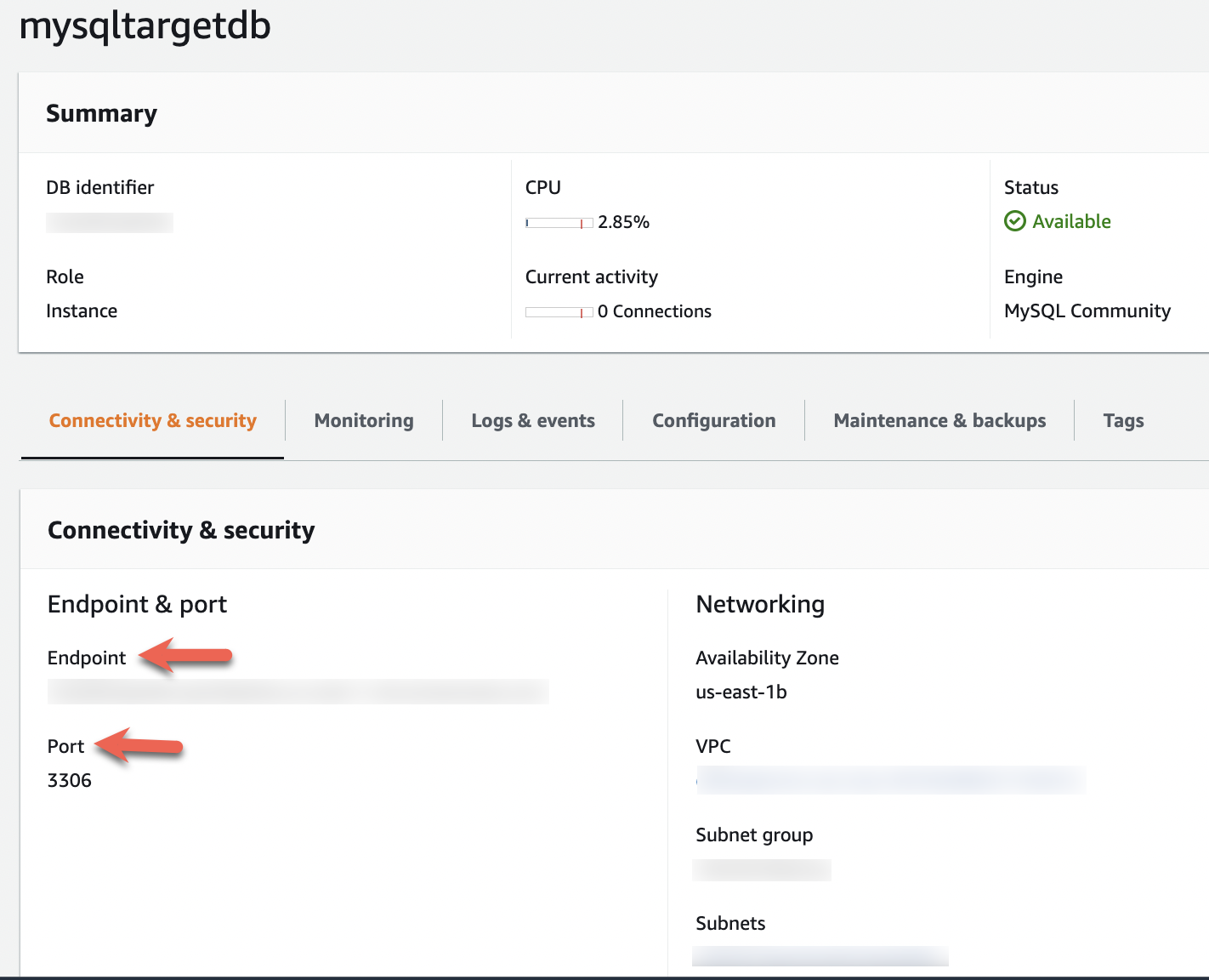 - On the Connectivity & security tab, copy the endpoint and port details.