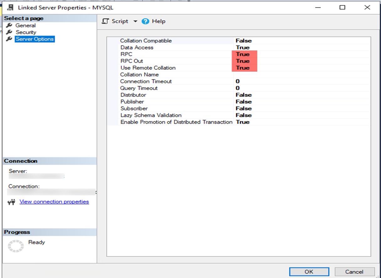 - On the Server Options page, set the values for RPC, RPC OUT, and Use Remote Collation to True.