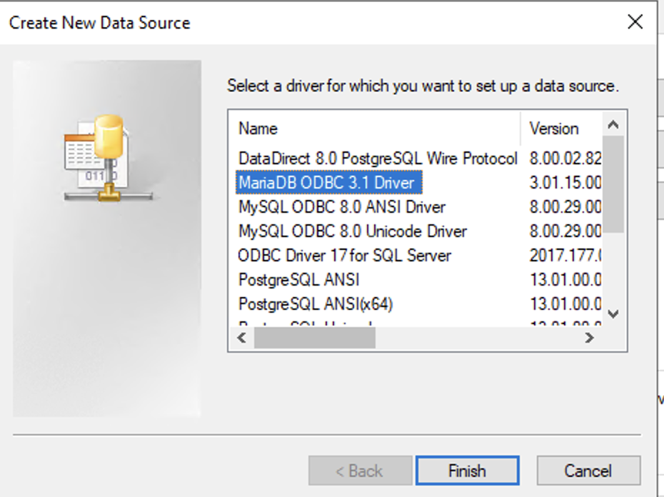 - Choose the MariaDB driver for which you want to set up a data source.