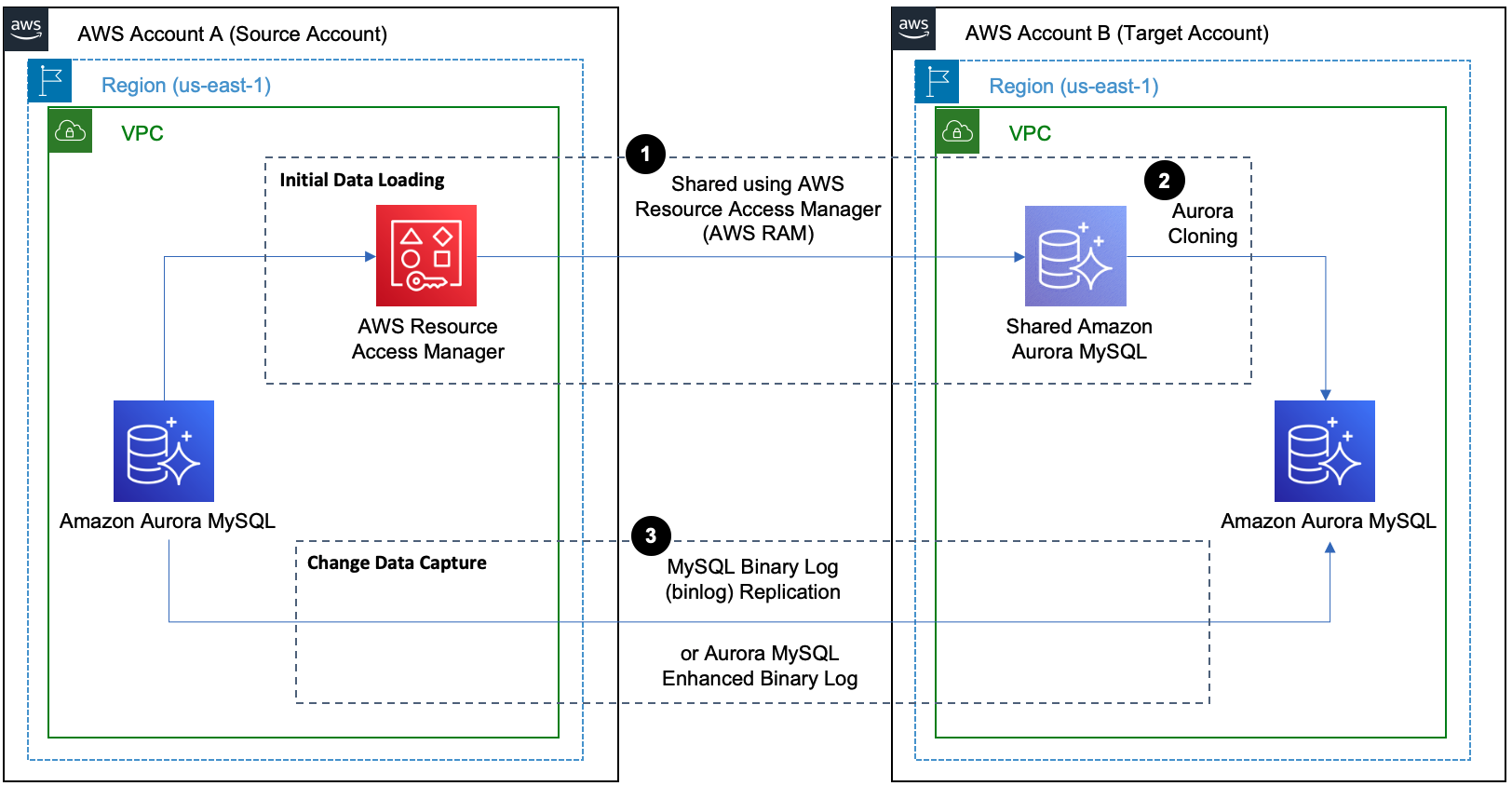 In this post, we use AWS Resource Access Manager (AWS RAM) to share the Aurora MySQL DB cluster with the target AWS account and Aurora cloning for initial data load. We also use MySQL binary log replication for change data capture.