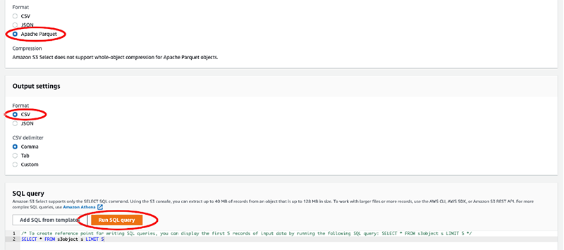 The query allows you to run SQL query directly on the Parquet file replicated by AWS DMS. Select CVS format as the output.