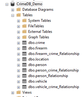 Make sure that the CrimeDB_Demo database and tables have been created successfully. The data in the tables represents mock crime analysis application data, and is designed to allow you to get a feel for how to use a familiar ETL tool (SSIS) for exporting relational data in a graph model that fits the target (Neptune database). You can see the following list of tables after the demo database is created.
