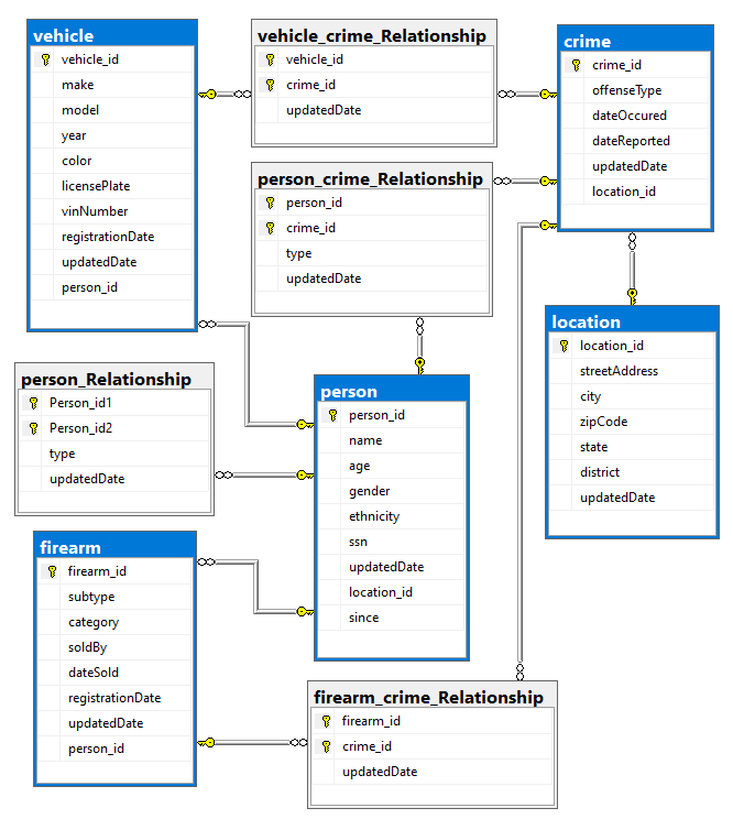 In the following entity-relationship diagram, the CrimeDB_Demo database contains nine tables related with one-to-many and many-to-many relationships. The Crime table holds information about crimes committed. Related details such as the person who committed the crime, the firearm used in the crime, court cases about a specific crime, and so on are stored in their respective tables. When many-to-many relationships occur in the model, you must introduce a JOIN table that holds foreign keys of both the participating tables. For example, the person_crime_Relationship table shows this concept of connecting a person from the Person table to a specific crime in the Crime table by creating a Person-Crime join table containing the ID of the person in one column and the ID of the associated crime in the next column.