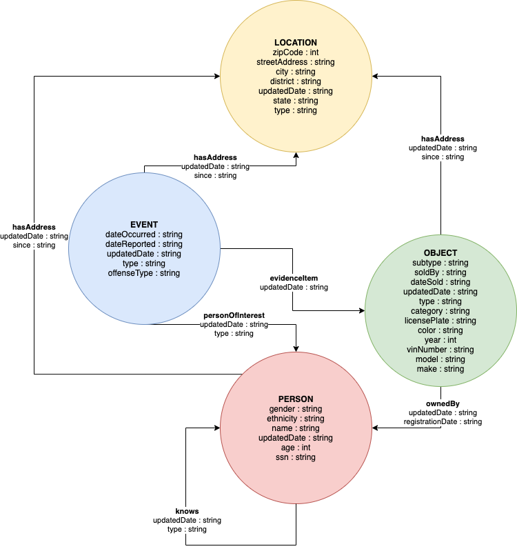 For our crime database example, we use the labeled property graph model. In this framework, data is organized into vertices and edges, each of which has a label to categorize similar types of entities into groups. Each vertex and edge can also hold properties (key-value pairs) that describe additional attributes of a particular entity. We’re interested in understanding how different crimes, people, locations, and objects are related to one another, and the property graph model represents our data in an intuitive way. It also makes it easier for us to write traversals based on what attributes a vertex or edge has, and to write questions like “How is person X connected to crime Y?”