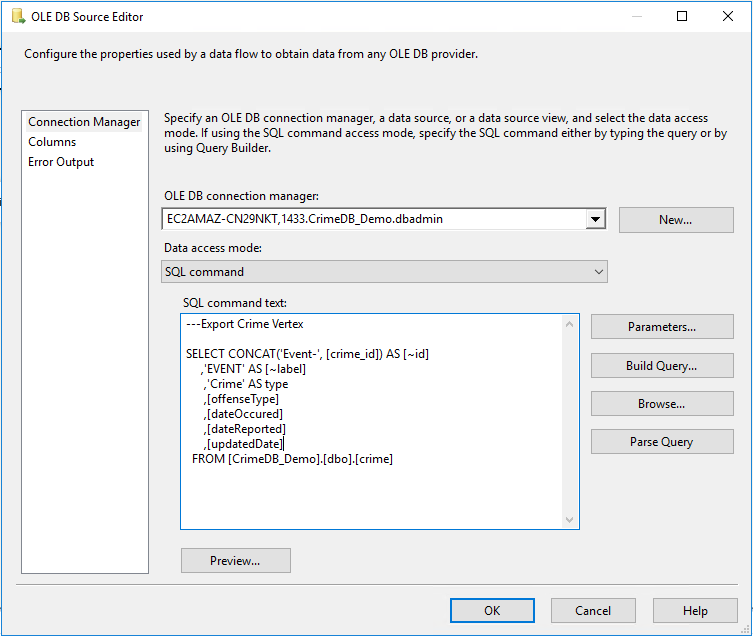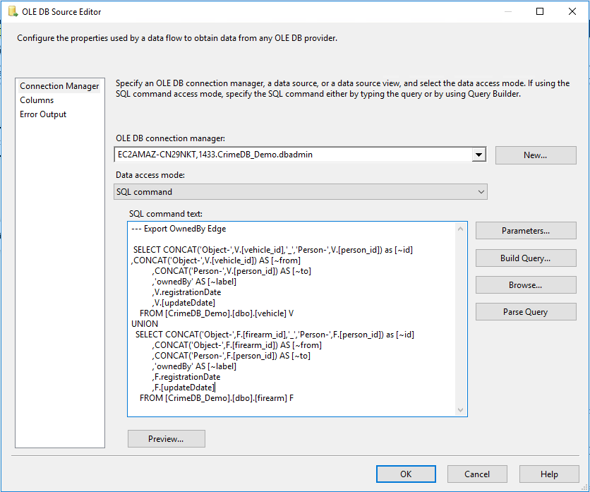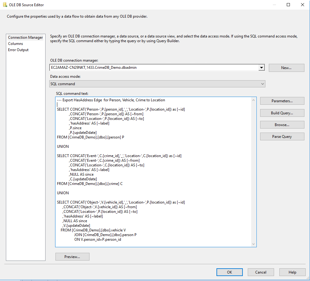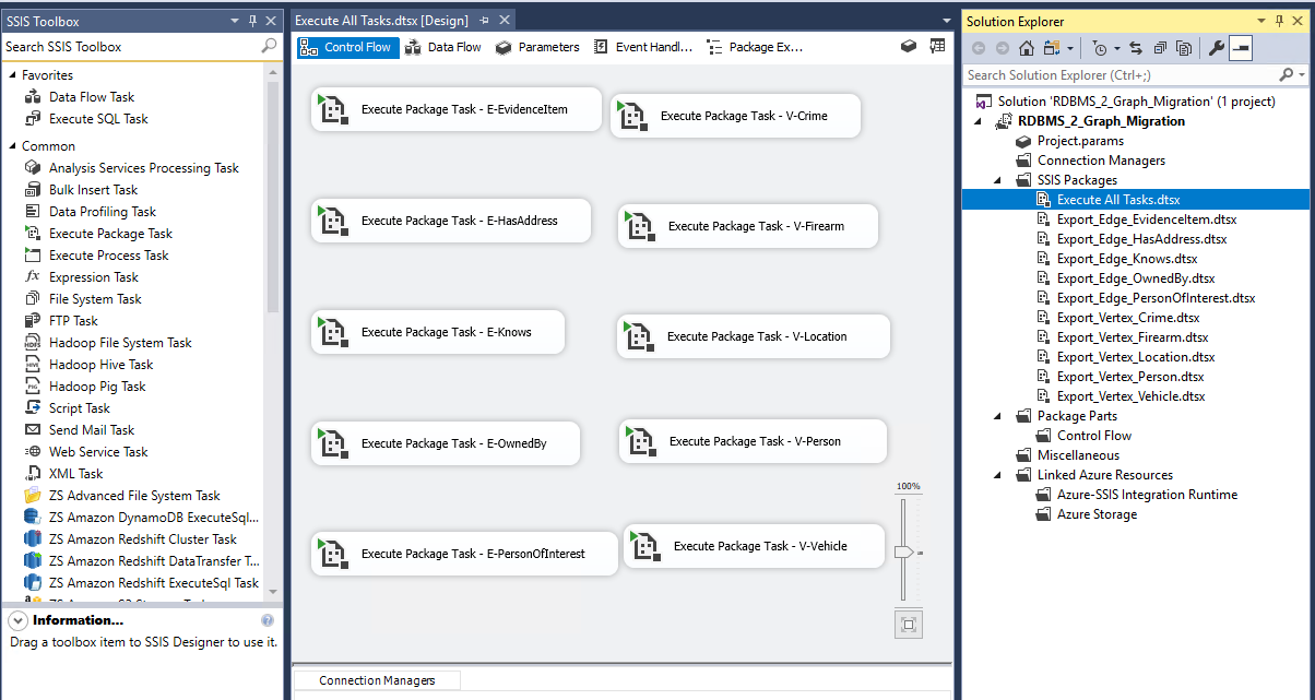 For conversion, you can run SQL queries against the source database for use as the data source in the SSIS package. A separate file is created for each node and edges extracted from the relational table. For each select query in the following script, create a separate SSIS package, 2-SSIS ETL Code Initial Load.sql.