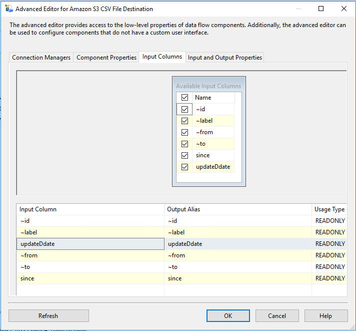 - Create separate packages for each node and edge, providing an S3 bucket name and file path for each destination file and confirming the input columns to be mapped.