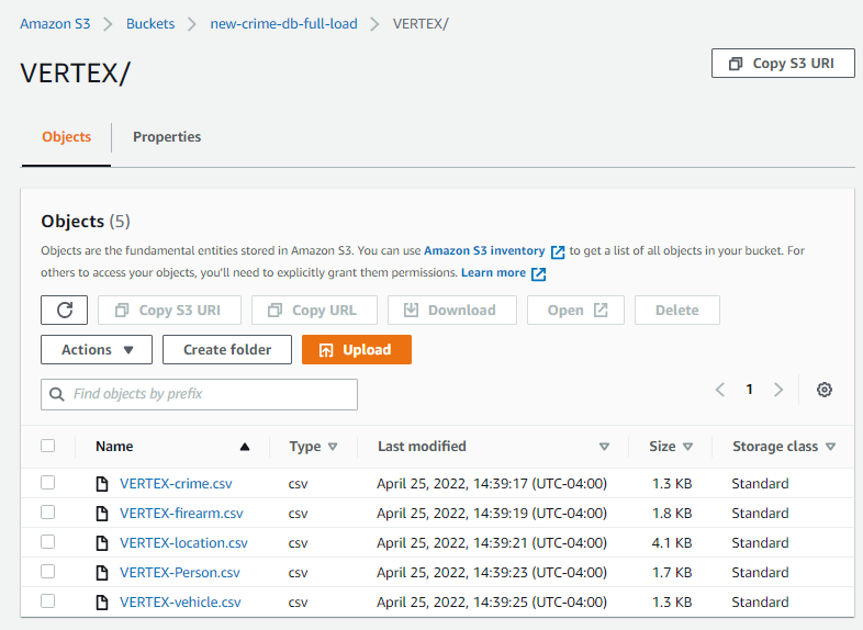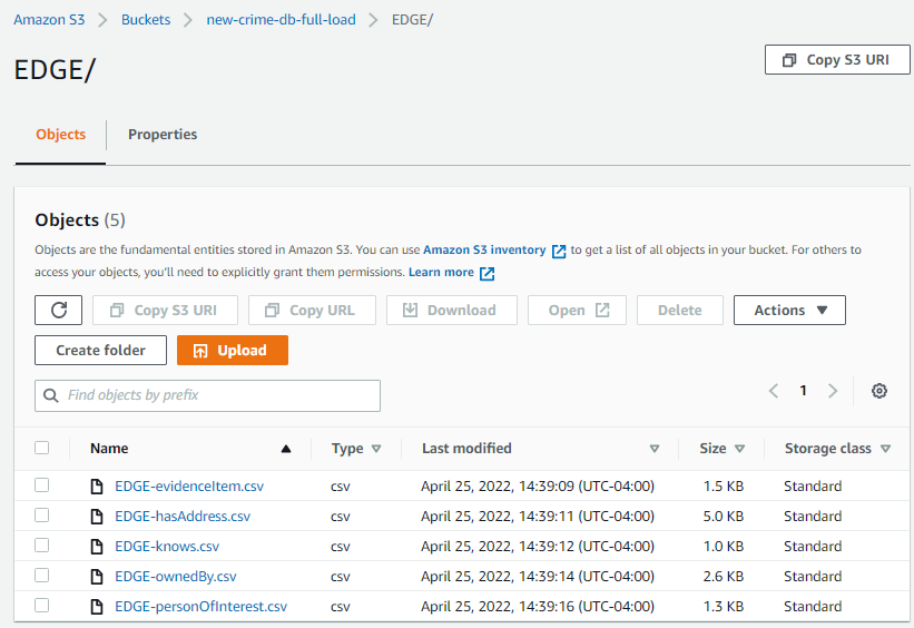 Upon completion of SSIS package creation and running all the packages, the S3 bucket should display 10 CSV files (five vertices and five edges) exported by the SSIS package. You can confirm the files were delivered to Amazon S3 via the Amazon S3 console.