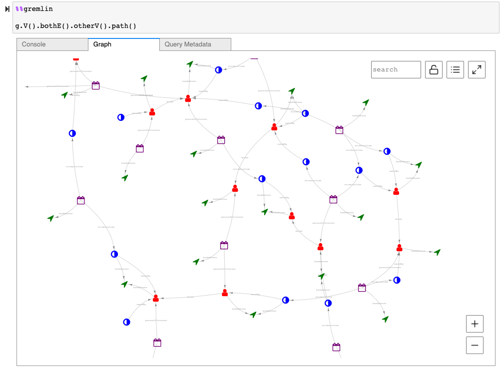 Running this cell lets us specify which icons we want to use to represent nodes of a given label (Person, Location, Object, or Event). We also specify the color of each type of node. To learn about other visualization options that you can adjust through the cell magic, follow along with the sample notebook Grouping-and-Appearance-Customization-Gremlin.ipynb.