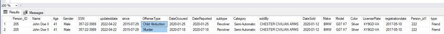 Let’s say we want to find everything we have for John Doe II: his address, crimes he was involved in, firearms he owns, vehicles registered to him, and other people who are associated with him. In our relational database, joins are computed at query time by matching primary and foreign keys of all rows in the connected tables. We have to use the foreign key columns in each base table and the lookup tables that establish the many-to-many relationships. To retrieve the records that answer this question, we will have to join six tables, using a sample script 4-Selecting from the tables-question1.sql.