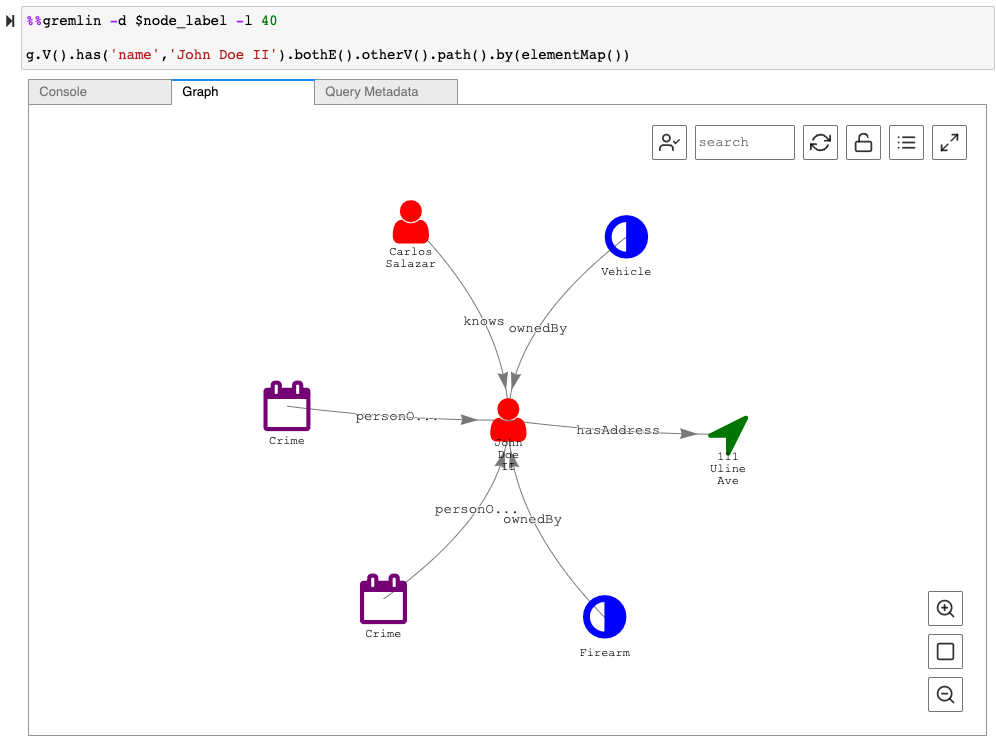 From our earlier view of John Doe II, we observed that he was only directly connected to two crimes. But with our expanded query, we can determine that he is potentially connected to three additional crimes, via his connections through objects he owns and a person he knows.