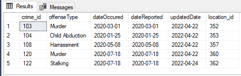 | 5 | {'dateOccured': ['2020-01-25 00:00:00'], 'dateReported': ['2020-01-25 00:00:00'], 'updatedDate': ['2022-04-22 00:00:00'], 'type': ['Crime'], 'offenseType': ['Child Abduction']} |