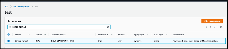 binlog_format = ROW). Enable automated backup for Amazon RDS for MySQL, Amazon RDS for MariaDB and setbinlog_format = ROWfor Amazon Aurora MySQL-Compatible Edition.