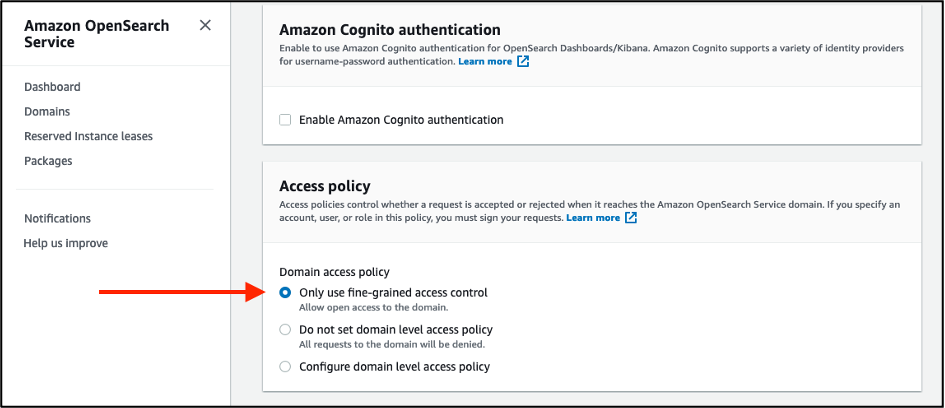 Configure the Access policy to “Only use fine-grained access control” to allow Lambda to access the Amazon OpenSearch Service