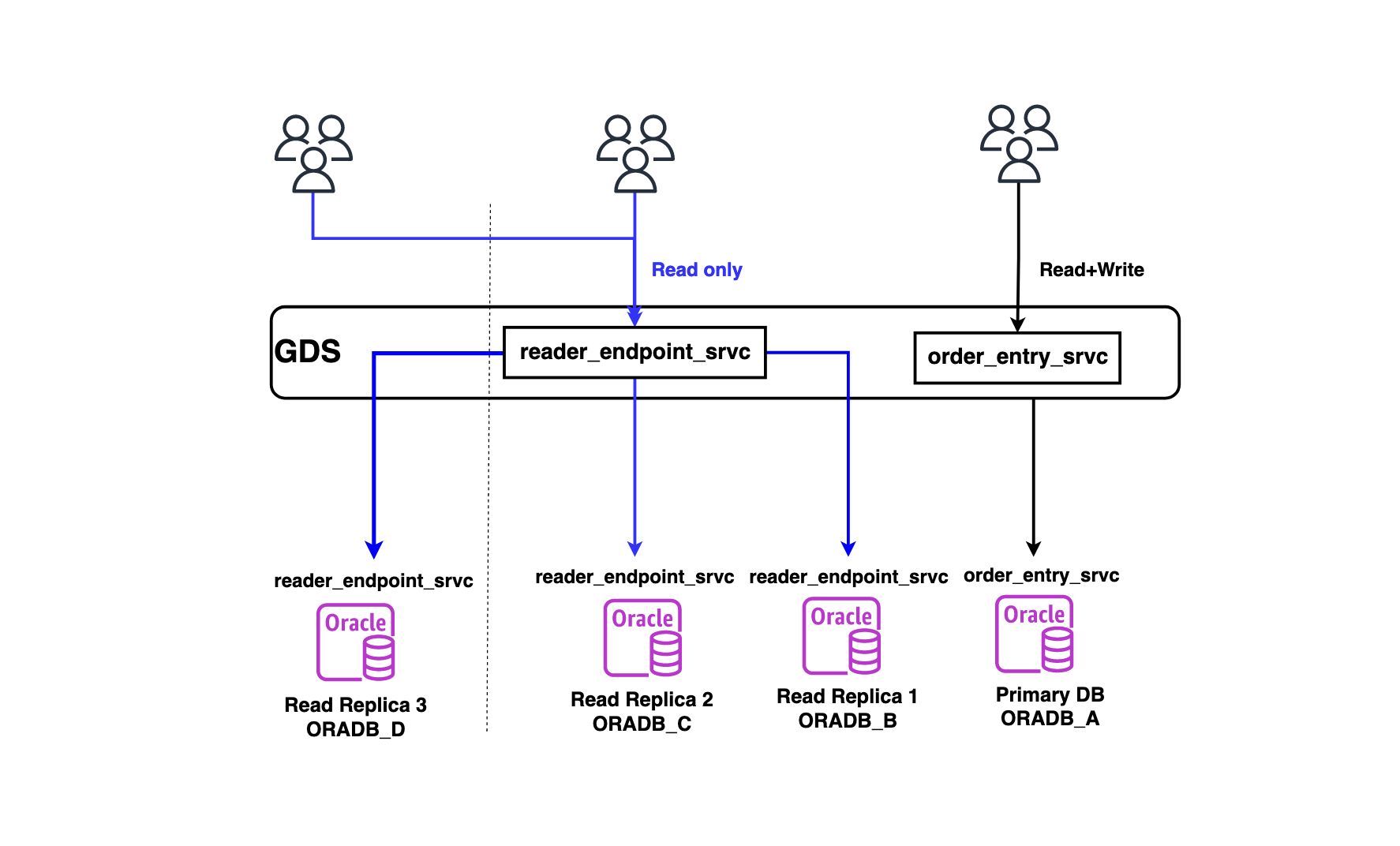 - Read workload load balancing – Load balancing is a fundamental component of Oracle GDS. It automatically distributes incoming workloads across multiple DB instances based on predefined criteria, such as current system load, location, or available resources. By doing so, Oracle GDS optimizes resource utilization, preventing overloads on individual databases and ensuring equitable performance across the entire system.