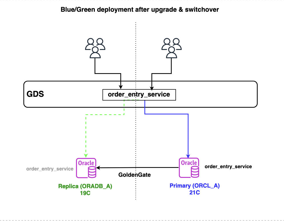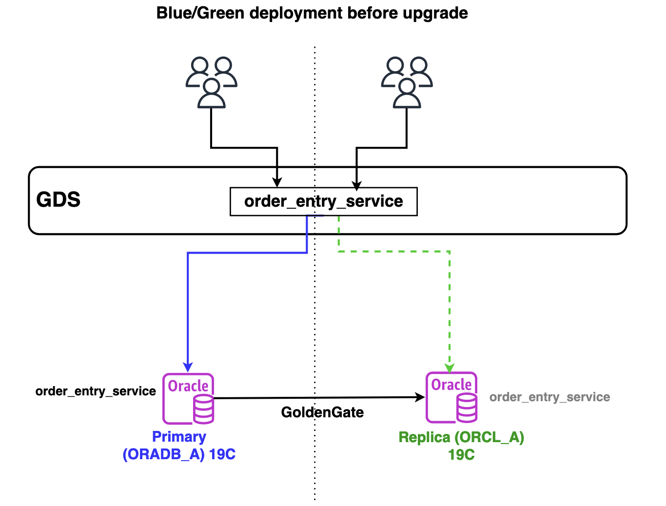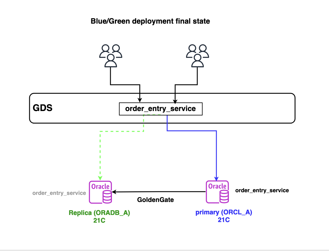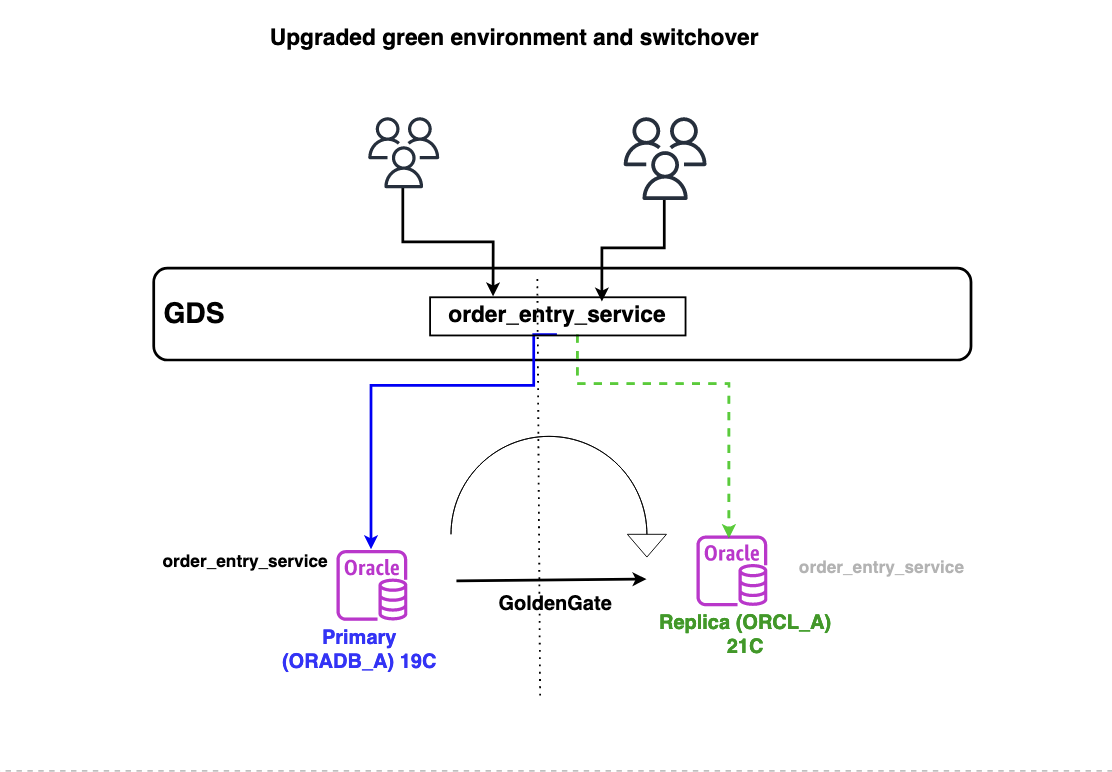 For this particular scenario, we set up a global service named order_entry_srvc. This service is configured to run on the blue deployment of the database while remaining available on the green deployment. When a role switch occurs, order_entry_srvc will be stopped on the former blue deployment and initiated on the current blue deployment, providing a seamless transition for an application.