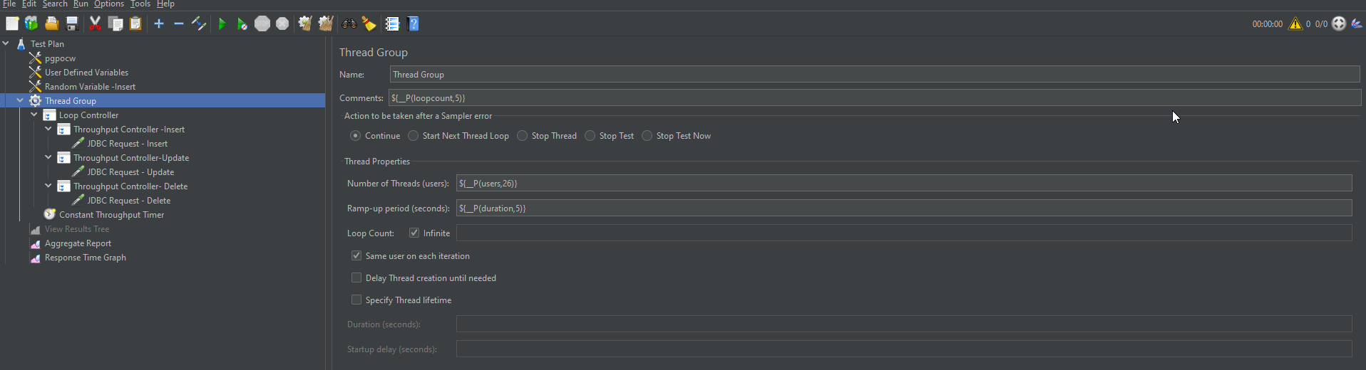 During the ramp-up period, you can set users to 100 and period to 60 seconds, so that it creates 100 users in the span of 1 minute, which is approximately 0.6 seconds per user (100 users / 60 seconds). You can set the loop count to 100 or forever, which tells you how many times you want to repeat your test. For our testing purposes we use forever, so we can generate sufficient load and can stop it when we have sufficient data to understand key performance indicators (KPIs).