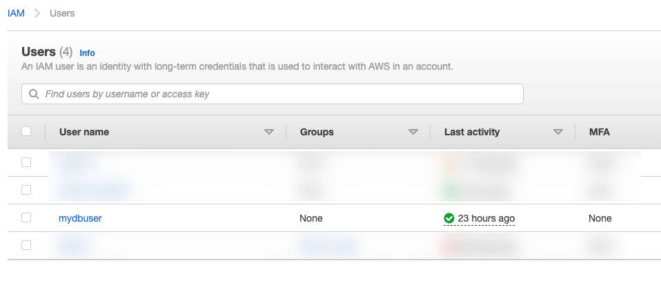 The following is an example with the user mydbuser created through the AWS CLI. You can verify this through the AWS CLI by running the following code: