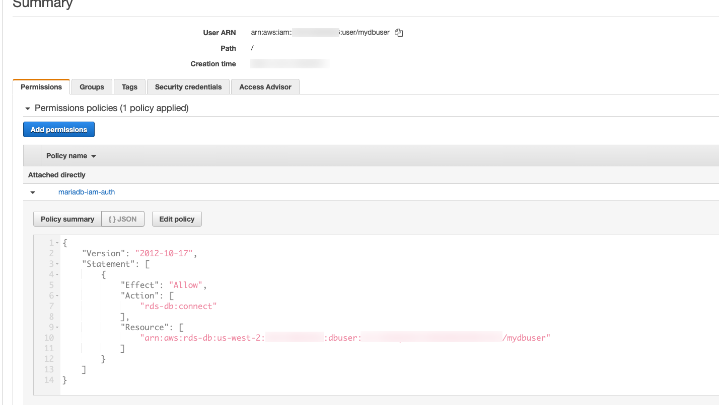 - Attach the policy to the user to allow the user authorization to connect to the RDS for MariaDB database. You can do this by issuing the following AWS CLI command: