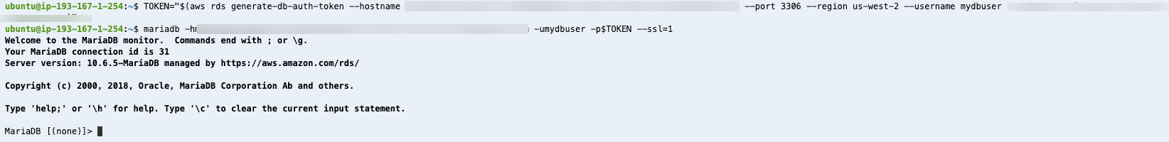 Using the MariaDB Client, use the token as the password parameter to log in to your MariaDB instance using the following command: