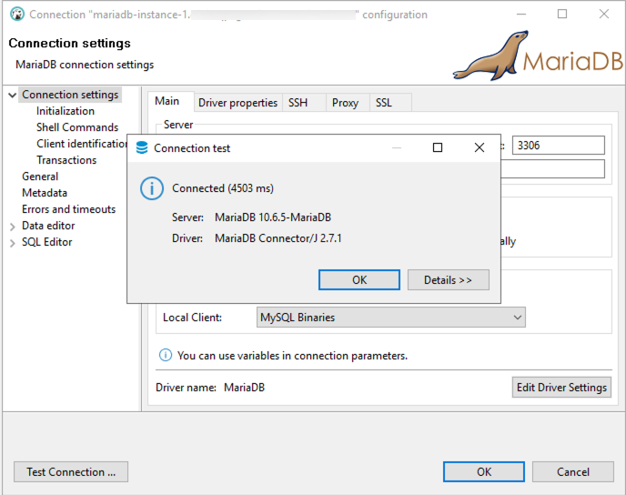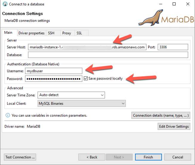 You can also use a database GUI tool such as MySQL Workbench or DBeaver to connect to your RDS for MariaDB instance using IAM authentication. These tools can be running on an EC2 instance or on your workstation a with VPN connection to your VPC. We use DBeaver as an example.