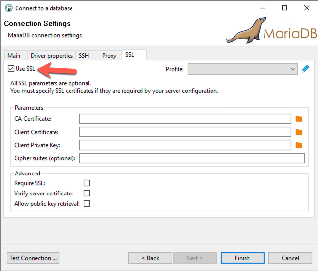 Next, you need to set the SSL parameters. This enables the connection to use encryption. If you’re verifying server certificates, you need to enter the appropriate settings. In this example, we don’t verify the server certificate.