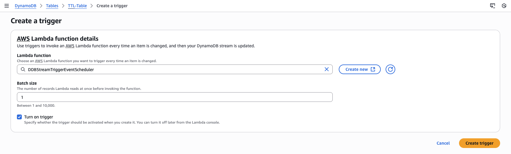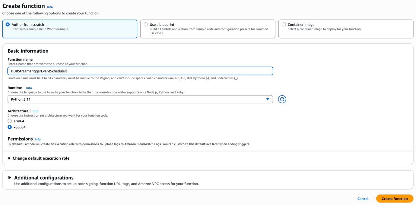 This will enable DynamoDB Streams on the table to expose both the old and new state of items in the stream records, so you can manage updates on items’ TTL values. Next, we create the Lambda function that is invoked by the DynamoDB Stream.