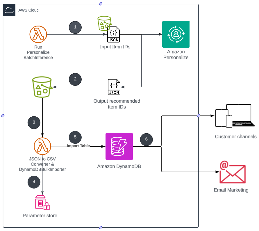 Although Amazon Personalize provides a convenient way to generate recommendations, storing and retrieving them efficiently can be a challenge, especially for large datasets. We see that customers use Amazon DynamoDB, a serverless, NoSQL, fully managed database with single-digit millisecond performance at any scale, to solve this challenge. As the number of recommendations or users grows, DynamoDB automatically scales database throughput and storage to nearly unlimited capacity. DynamoDB is well-suited for workloads that require consistent high performance, which is essential for providing a smooth user experience when retrieving and displaying personalized recommendations in real-time. In this post, we explore how to import pre-generated Amazon Personalize recommendations into DynamoDB.