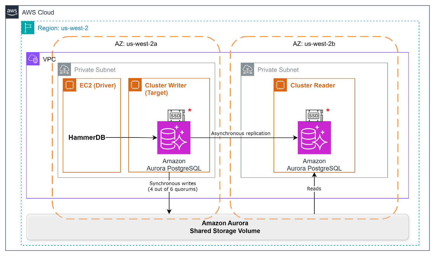 The following diagram illustrates the benchmark environment’s architecture, where we deployed EC2 instance running HammerDB (driver) to benchmark the Aurora cluster (target) with one writer and one reader instance, although no workload was running on the reader.