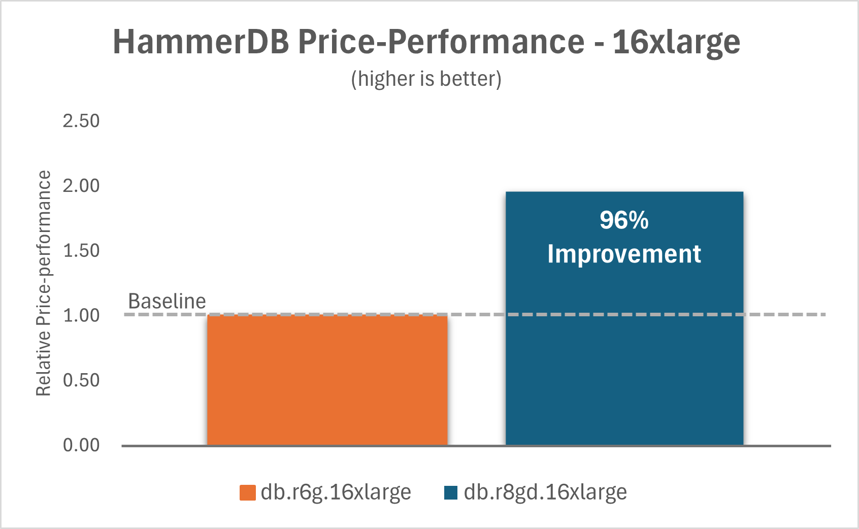 This metric combines an instance’s performance capabilities with its monthly cost to determine the value (performance) you receive for each dollar invested. We calculated this ratio using HammerDB NOPM divided by the instance’s on-demand monthly price on the US West (Oregon) AWS Region. A higher ratio indicates better value for your investment, because you’re achieving more database transactions per dollar.