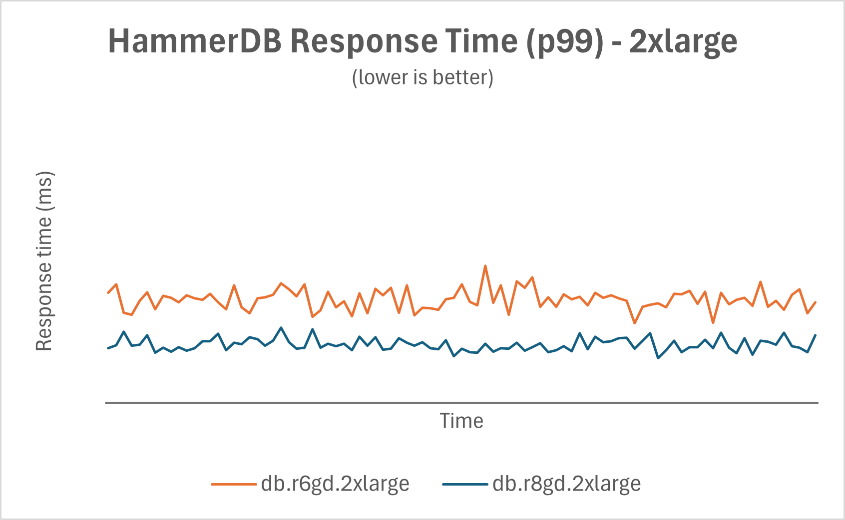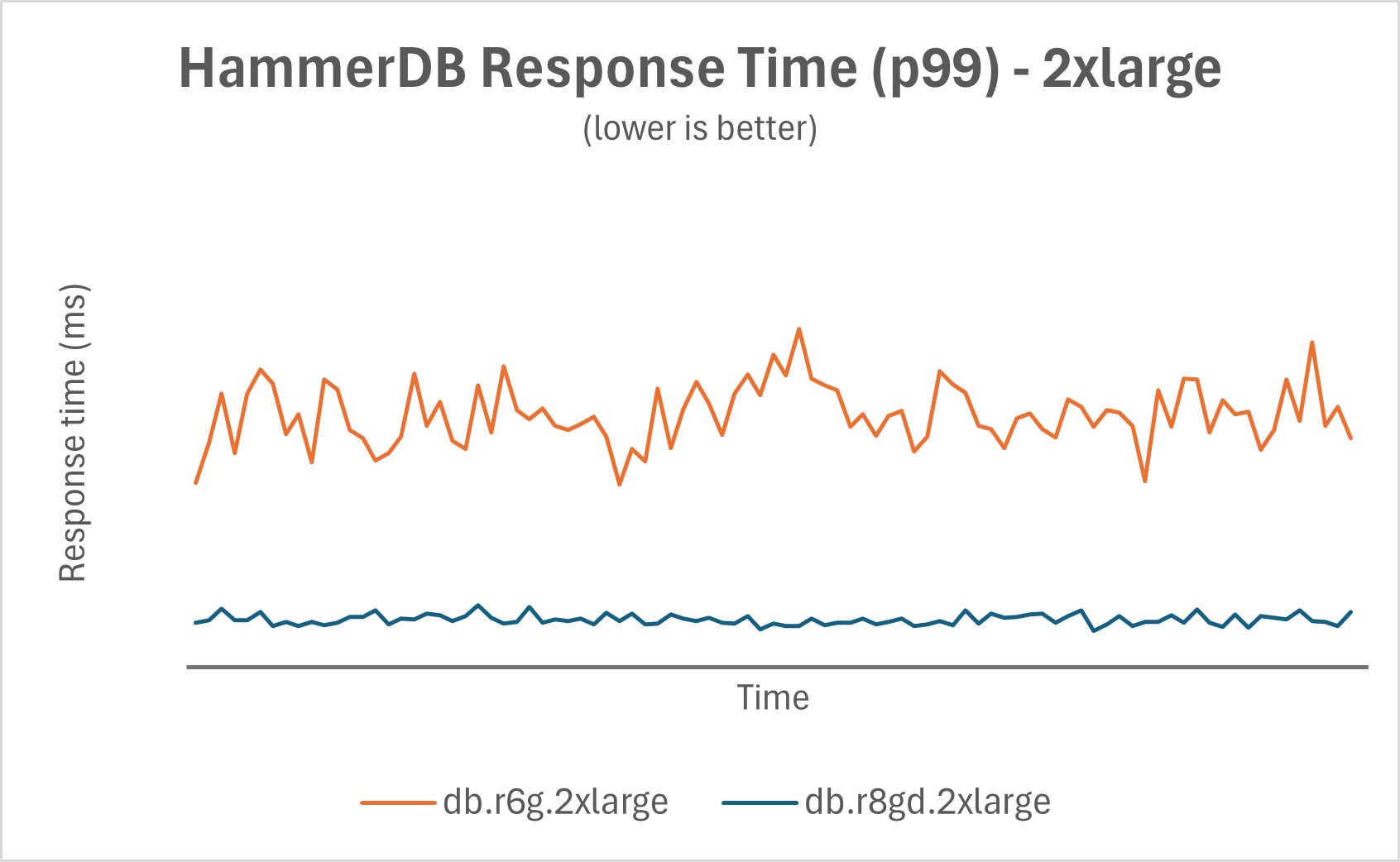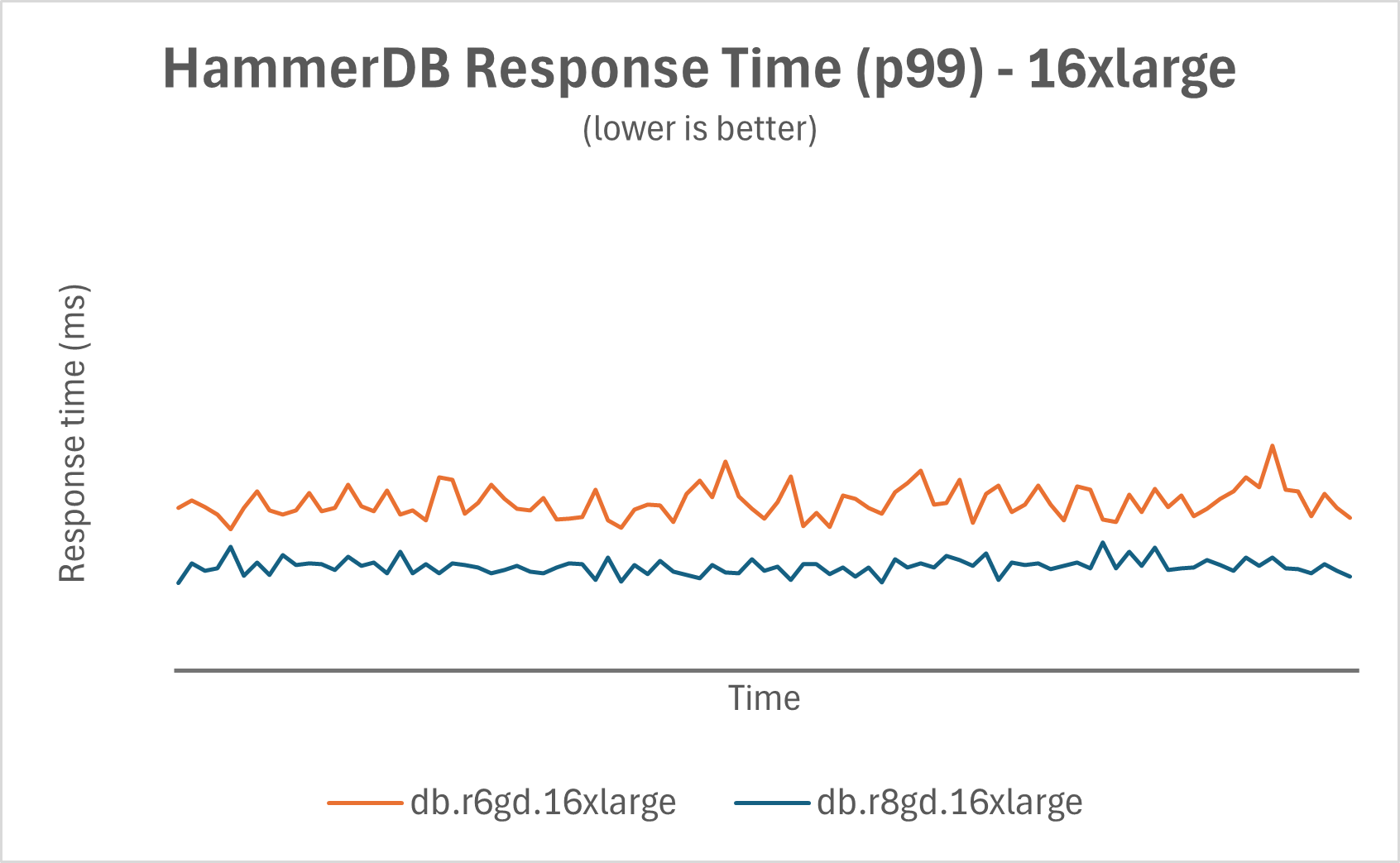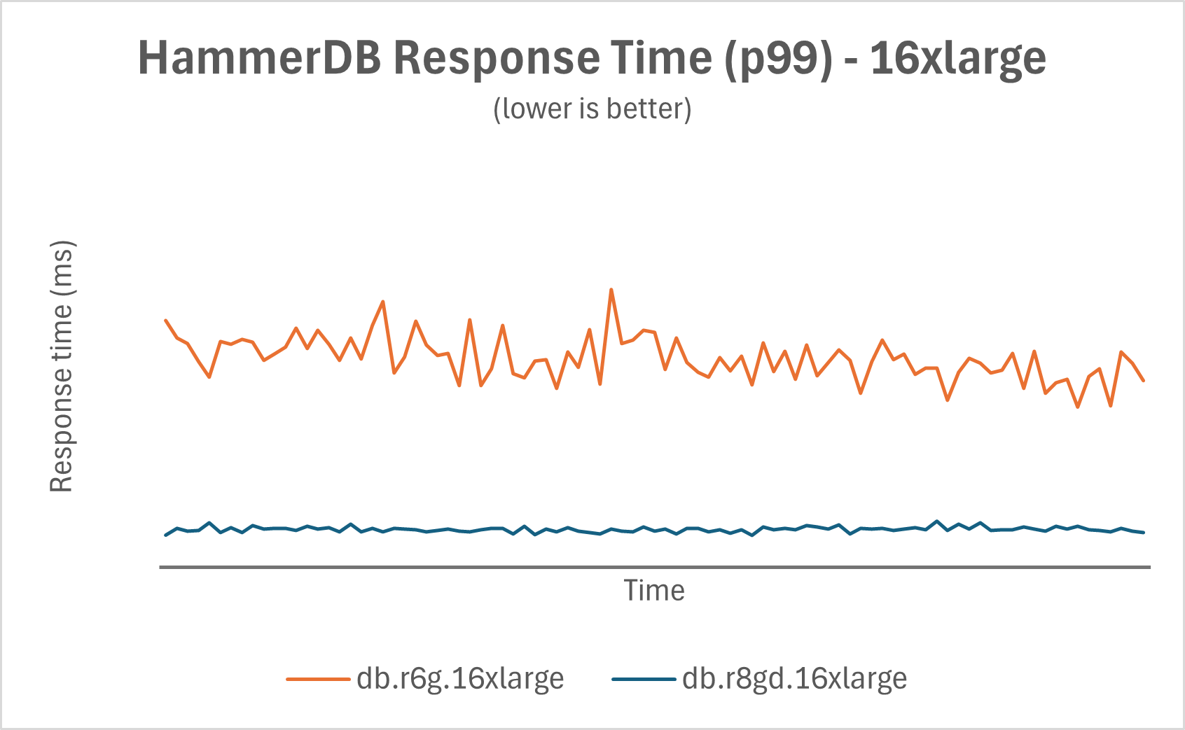 The db.r8gd maintains lower response time with superior consistency resulting in more predictable query execution times and improved performance variability. The following chart shows a snippet of HammerDB response time (p99) over time with lower fluctuation.