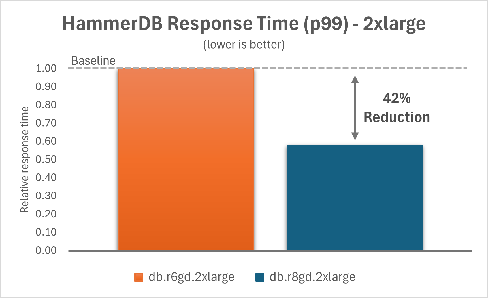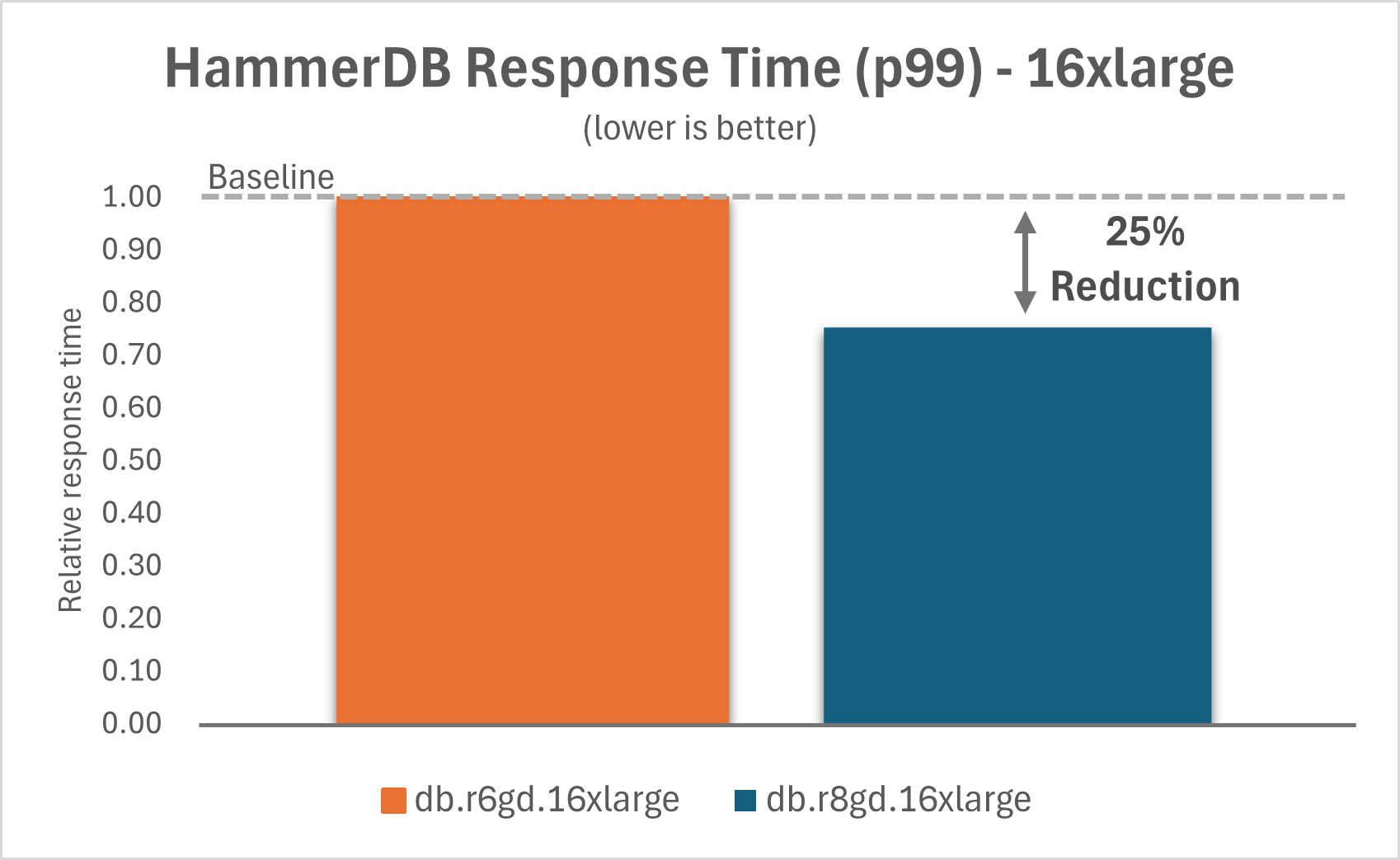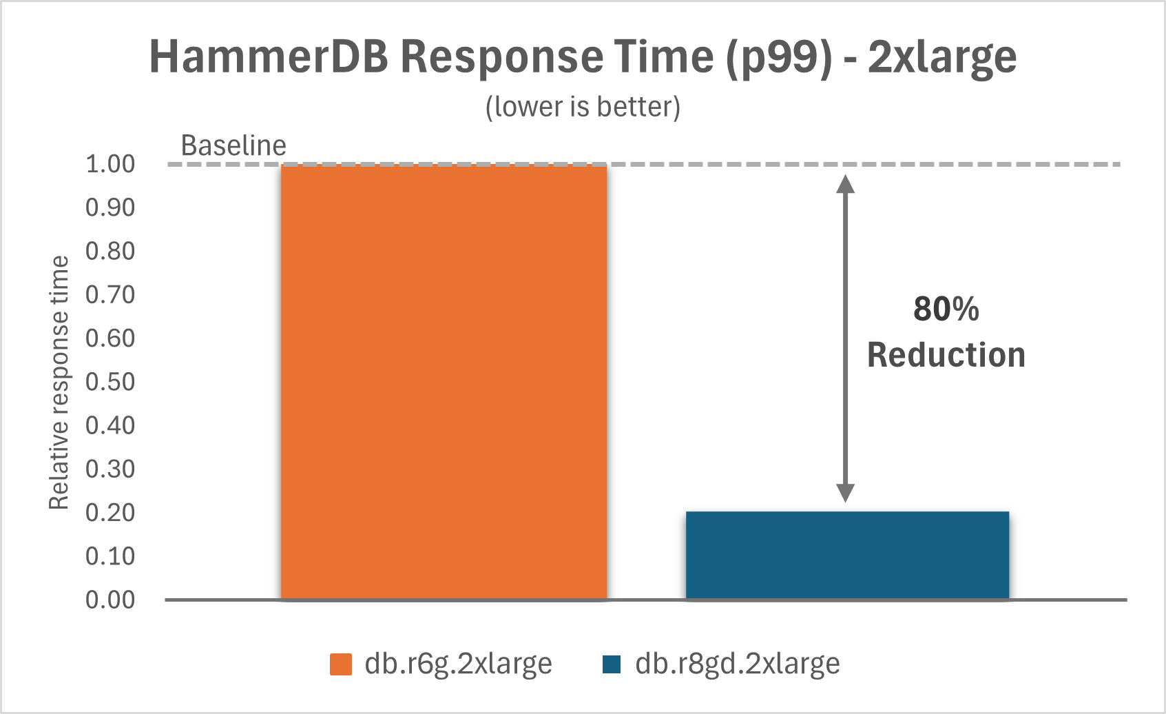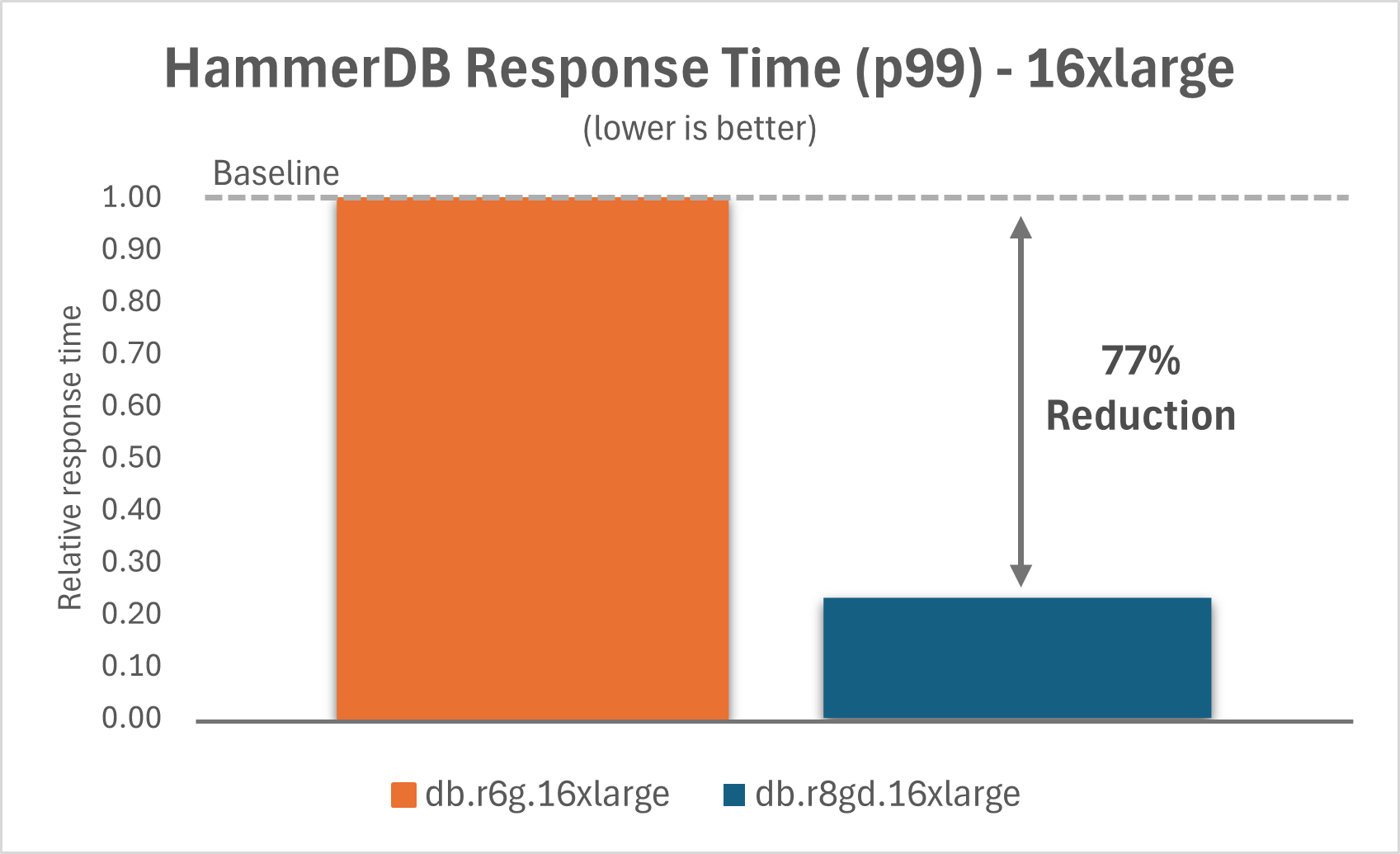 The db.r8gd maintains lower response time with superior consistency resulting in more predictable query execution times and improved performance variability. The following chart shows a snippet of HammerDB response time (p99) over time with lower fluctuation.