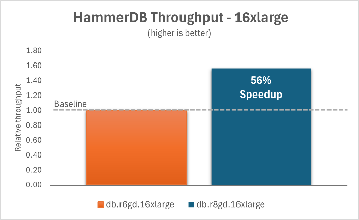 The results show that R8gd instances with Aurora PostgreSQL 17.5 can offer substantial improvements up to 165% higher throughput, up to 120% better price-performance ratio and up to 80% improvement in application response time, while also providing up to 256 TiB of storage space and flexibility of temporary objects storage size adjustments without cluster restart.