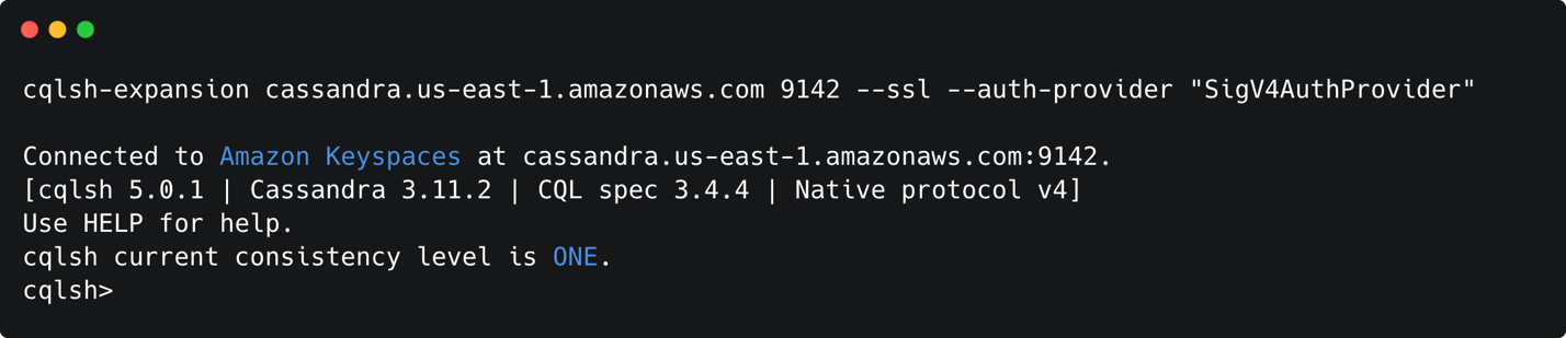 Figure 2: A screenshot of a terminal using the cqlsh-expansion python library to connect to Amazon Keyspaces