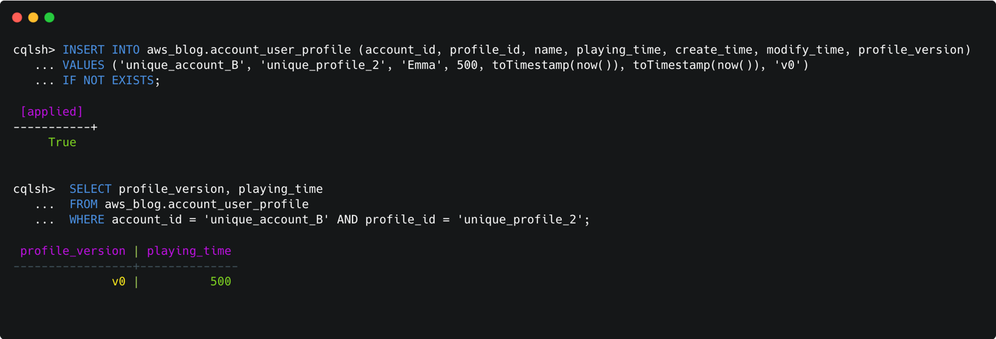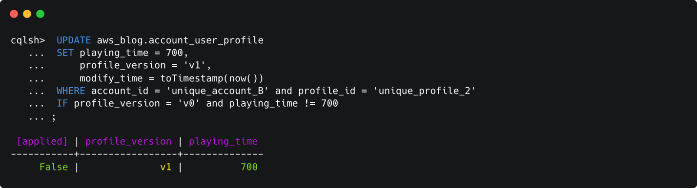 Next, modify the account by adding an additional profile. Similar to the previous step, you can perform this operation by checking the account_version static column and profile_version. The new profile has a playing time of 600, so you need to adjust the account_playing_time for a total of 1300. The following statement makes a conditional check on the account_version, modifies the account_playing_time, and inserts a new row.