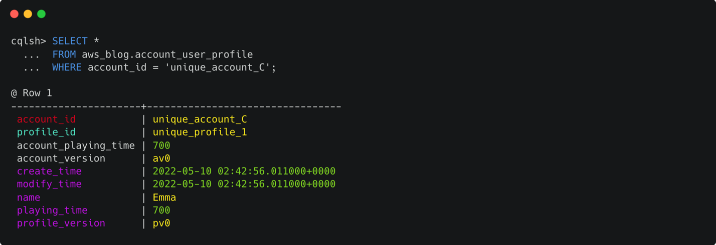 Verify the results by running the SELECT statement. You should receive a profile_version v1 and playing_time of 700.