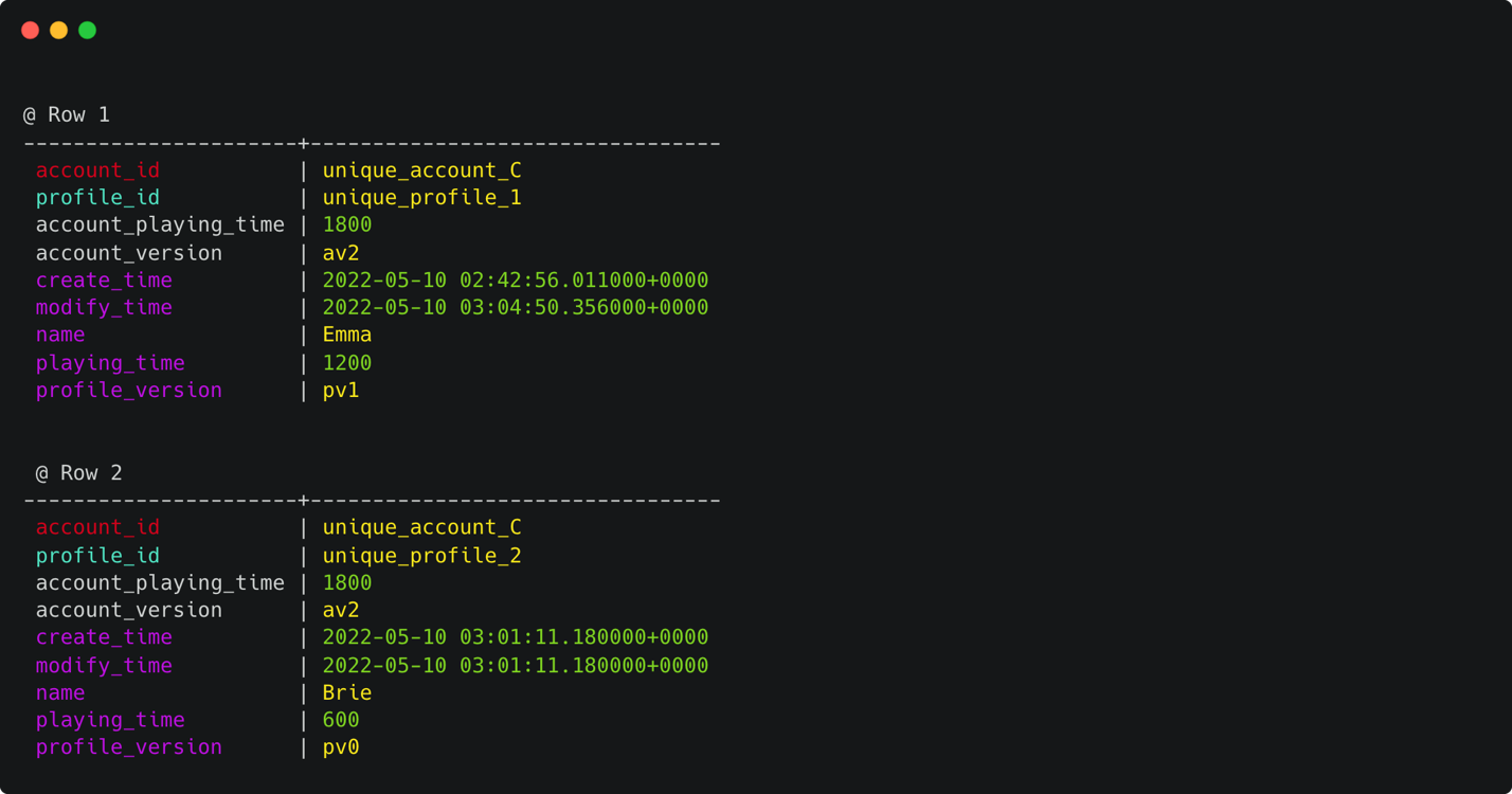 Figure 12 that follows shows output that verifies the state after adding an additional profile. You can see that account_version is incremented and profile_version is initialized as version 0. The account_playing_time was updated to 1300 to represent the aggregate of both profiles’ playing_time. Again, the fields create_time and modify_time are omitted in the select statement for readability.