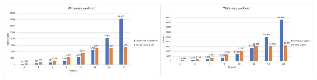 As the number of threads increase (x-axis), we see InnoDB peak out much earlier than MyRocks. This is where MyRocks shines, scaling up to 14,255 transactions/sec, vs. InnoDB’s peak at around 5,461 transactions/sec. The number of transactions also peaked much earlier in InnoDB at around 32 threads vs. MyRocks at around 128 threads.