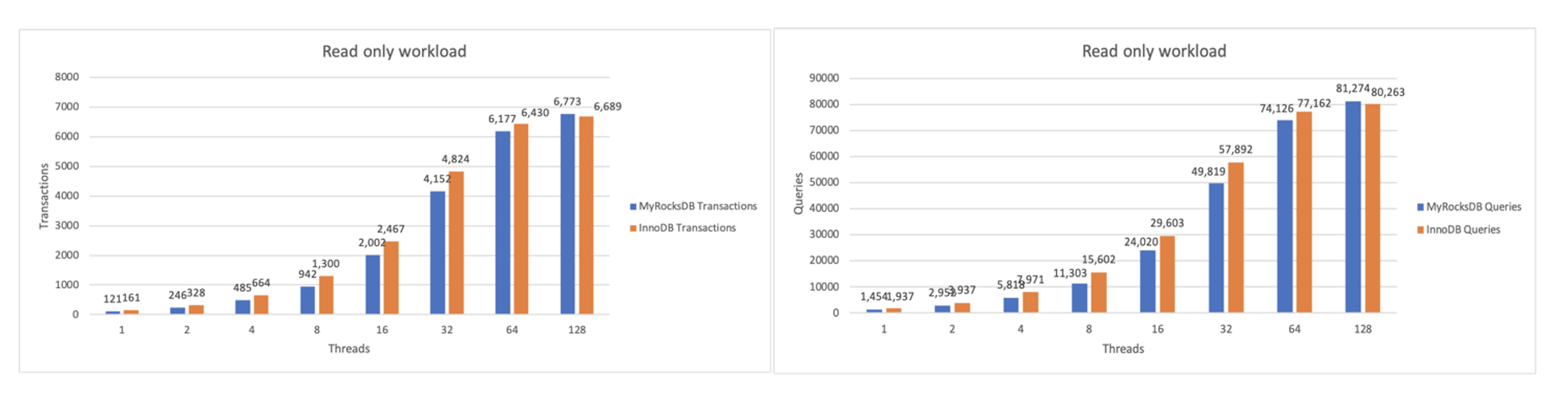 Finally, we tested the read workload with a similar parameter configuration as the write workload. As shown in the following graphs, both InnoDB and MyRocks exhibited similar read performance. We didn’t see any significant differences in read transactions per second between the two storage engines. However, your results may vary depending on your workload and instance configuration. Therefore, we recommend to benchmarking with your actual workload.