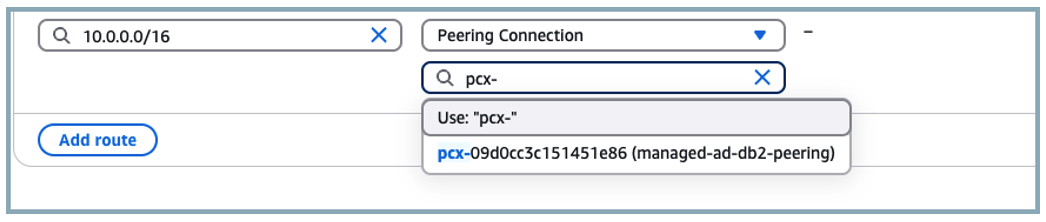 - On the drop-down menu for Target, choose Peering Connection and then select the matching peering connection ID starting with pcx-.