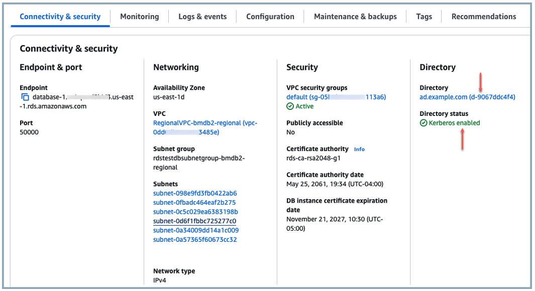 - After the instance creation is successful, you can choose the instance and check the Connectivity & security The directory used is the shared directory and Kerberos is enabled.