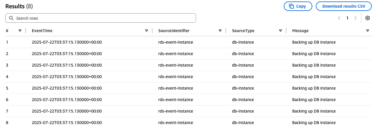 Now, you can query the Amazon RDS events depending on the data you want to gather. You can monitor backup compliance, track configuration changes across your Amazon RDS fleet, identify security-related modifications, and detect patterns in maintenance events. For example, the following query gathers the Amazon RDS events where a backup has started: