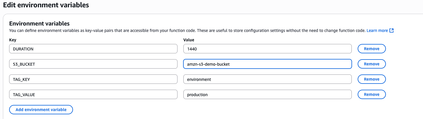The environment variables within the Lambda function control what the key and value combination must be when tagging your RDS instance. If you want to change the key or value, you can edit the Lambda function’s environment variables (TAG_KEY and TAG_VALUE).