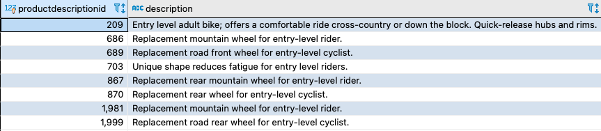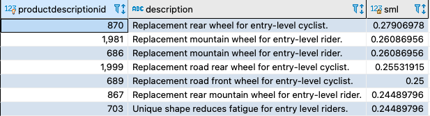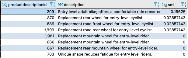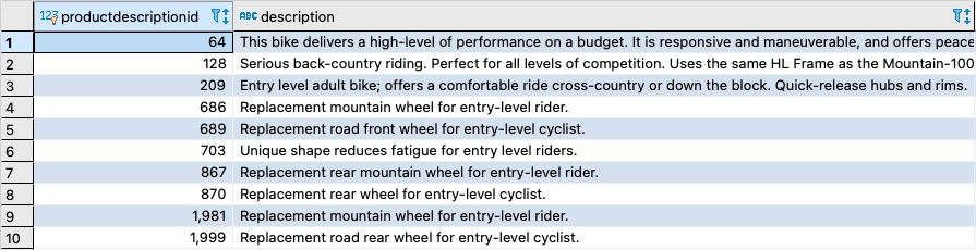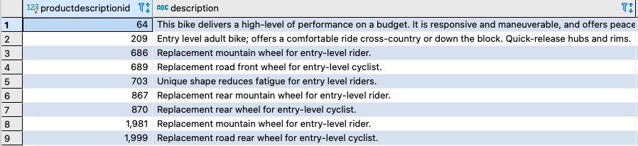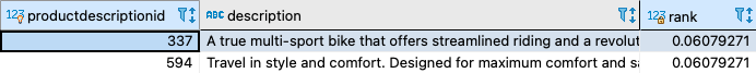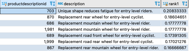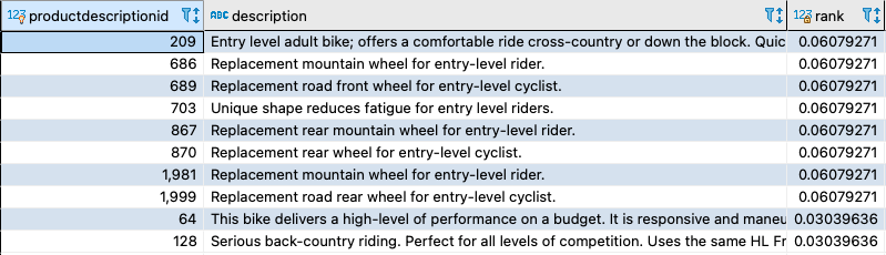 For the sample PostgreSQL queries shown earlier, the to_tsvector function gets the tsvector values out of the Description column from the productdescription table. In the following sections, we show you various options to improve query performance.
