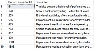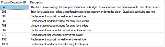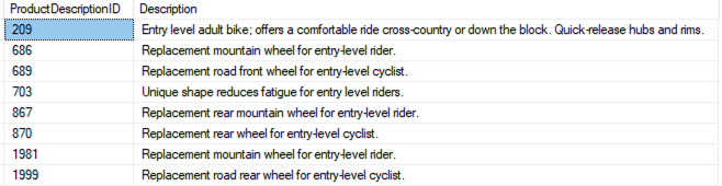 In the following sample queries, FREETEXT checks for the words “entry” or “level” and their forms (using stemming) in the Description column: