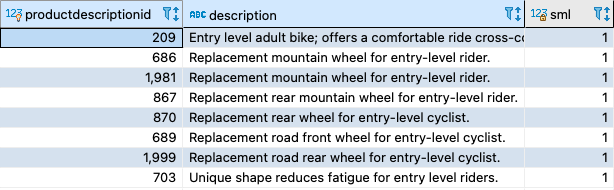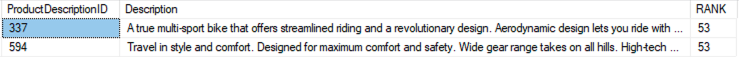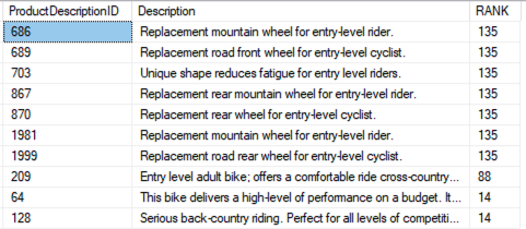 In the following sample queries, FREETEXTTABLE checks for the words “entry” or “level” and their forms (using stemming) in the Description column and also gets the RANK information: