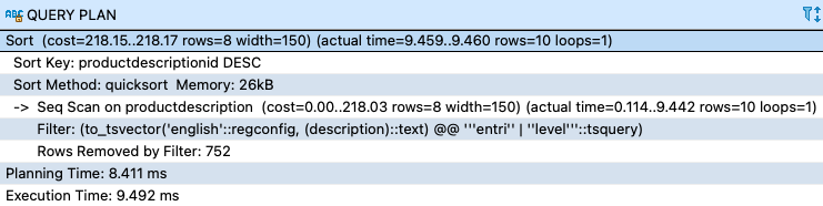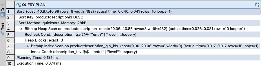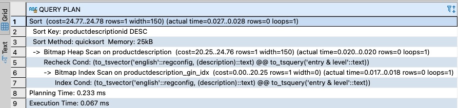 The output shows that a bitmap index scan is being performed on productdescription_gin_index, which in this case demonstrated an improvement in query performance: