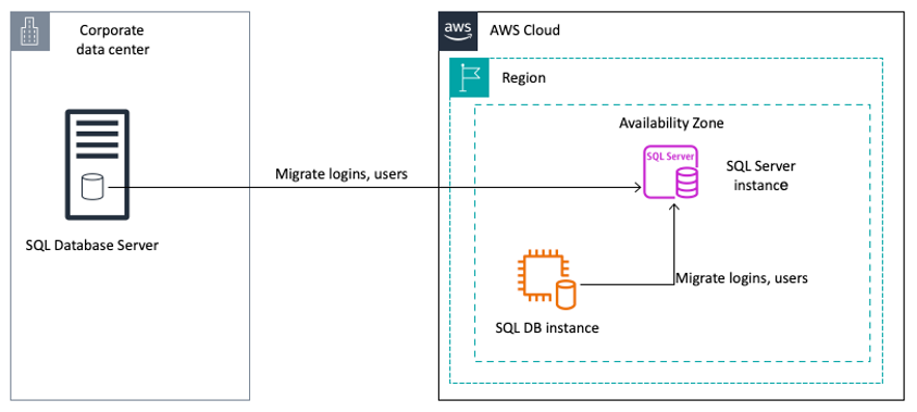The following diagram illustrates the high-level architecture of migrating logins and database users from on-premises or Amazon EC2 for SQL Server to Amazon RDS for SQL Server.